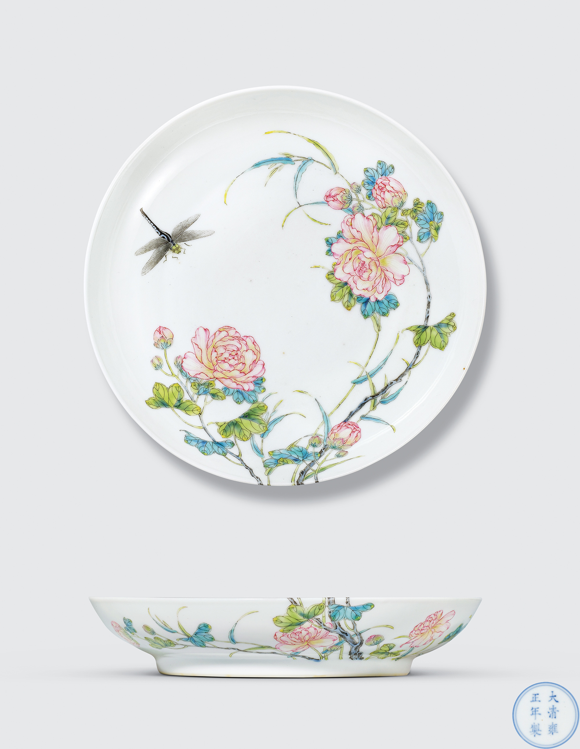 「Lot 970」清雍正 粉彩过枝芙蓉蜻蜓图盘,估价350万-550万人民币