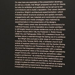 每个部分重点诠释赖特作品中的一个关键对象或者闪光点,并与艺术馆收藏的其他建筑设计作品进行比较,为专业建筑设计师和普通观众重新审视赖特作品提供了新的视角。