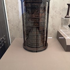 药柜通体黑漆描金,外部以龙纹装饰为主,柜门内侧则描绘花卉图案,柜背面有泥金填刻楷书「大明万历年造」六字款。该柜可盛放药品达140种,屉面上有涂金名签,标明每种药物的名称。