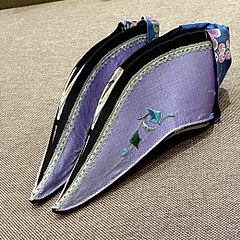 蓝色缎锁绣花卉纹尖足鞋,清代