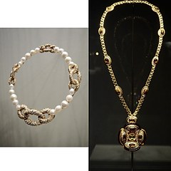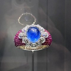 运用黄金和铂金制作,镶嵌红宝石、蓝宝石和钻石。