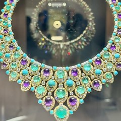 运用黄金和铂金制作,镶嵌祖母绿、紫水晶、绿松石和钻石。