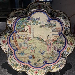 此碟以画珐琅和罩透明珐琅釉两种工艺相结合,开光外饰宝蓝色透明珐琅釉。清雅的画面搭配深色的边饰,釉色透明光亮,充分展示出地域特色。