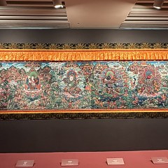 展览分为3个部分,第一部分展出《中国藏族文化艺术彩绘大观》(复制件),其原件由中国工艺美术大师宗者拉杰历时19年主持创作,达数百米之长,包括唐卡图案700多幅,浓缩了藏族的历史渊源、文化艺术、医药卫生、天文地理、生活习俗等内容。