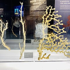 展厅现场还设置了400平方米的深海场景,借助3D打印技术再现冷水珊瑚、热液和冷泉三个生态系统,还原竹节珊瑚、扇珊瑚、柳珊瑚等14种珊瑚自然生长状态。亮点展品包括来自东太平洋中脊的热液喷口的岩石、管状蠕虫标本、贝壳类标本;来自中国南海冷泉区域的自生碳酸盐岩、深海潜铠虾标本等。
