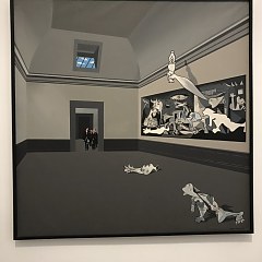这幅油画完成于1937年6月4日,由毕加索接受西班牙政府委托创作,描绘了人类历史上第一次地毯式轰炸——西班牙内战时期纳粹德国空袭格尔尼卡城的场景。画作使用黑白灰三色,表达毕加索对西班牙独裁者 Francisco Franco 以及法西斯主义的控诉。油画目前收藏在西班牙马德里索菲娅王后国家艺术中心博物馆。