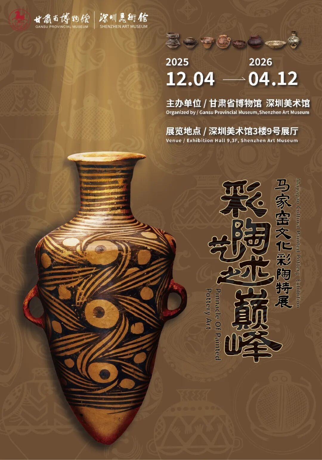 马家窑文化出现于黄河上游新石器时代晚期,距今约5000年,马家窑文化彩陶数量巨大、器型丰富、纹饰华美,代表着中国新石器时代彩陶艺术的高峰。本次展览将呈现甘肃省博物馆收藏的100余件马家窑文化彩陶,邀请参观者体会彩陶艺术的魅力。