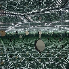 草间弥生将单一元素的强迫性重复和增殖所产生的自我与他人界限消失的感觉称为「自我消融」,这一感觉源自童年幻觉,并成为她的重要创作主题。起初草间弥生主要绘制画作,1957年移居美国后,她开始尝试「镜屋」等系列装置作品,这些作品有着无限的重复、镜子的反射、闪烁的光线等表现手法,更容易使人陷入恍惚。当1960年代后半期迷幻运动(the psychedelic movement)席卷美国时,草间弥生的作品被视为这一运动的重要组成部分。