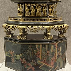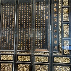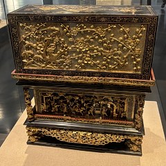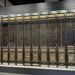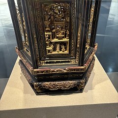 广东省博物馆内的「漆木精华——潮州木雕艺术展览」分为源流篇、制作篇、艺术篇、器用篇、欣赏篇共五个单元,共展出木雕实物200多件(套),品类丰富,精品叠出,如场面宏阔、精细入微的描金漆画诗经意境图大寿屏,玲珑剔透、栩栩如生的圆雕蟹篓,以及造型独特、精雕细刻的神龛、神亭、神轿、薰炉罩、馔盒、糖果架、纸煤筒等藏品。