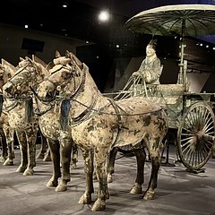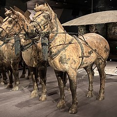 1980年,临潼秦始皇帝陵封土西侧的一个陪葬坑内出土了两乘大型陪葬铜车马,两乘车一前一后置于同一木椁中,经复原后大小约为真人真马的二分之一,制作年代不会晚于陵墓兴建时期,即公元前210年之前