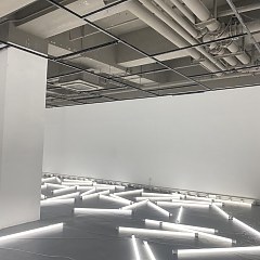 进入展厅,迎面而来的是一群蠕动的光管,暗示着后续到来的一种生物媒介集置(the bio-media assemblage)的演展——细菌粘液和微生物的黏性所培育出来的「机器」把墙体切成了一些尴尬的断面,留下一条勉强容人通过的小径;这个机器还按自己的逻辑制造了两辆卡在墙上的汽车,其中一辆大到近乎荒诞,穿透靠近天花板的墙的上半部分。
