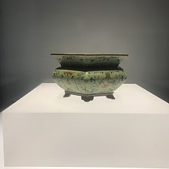 第二部分至第四部分展品均为馆藏器物,分别以「清瓷萃珍」「文房清玩」「稽古萃华」为主题,重点展品有明崇祯青花竹林七贤笔筒、清乾隆云龙纹小缸、清道光窑变釉石榴尊、吴大澂铭菊花石砚等。