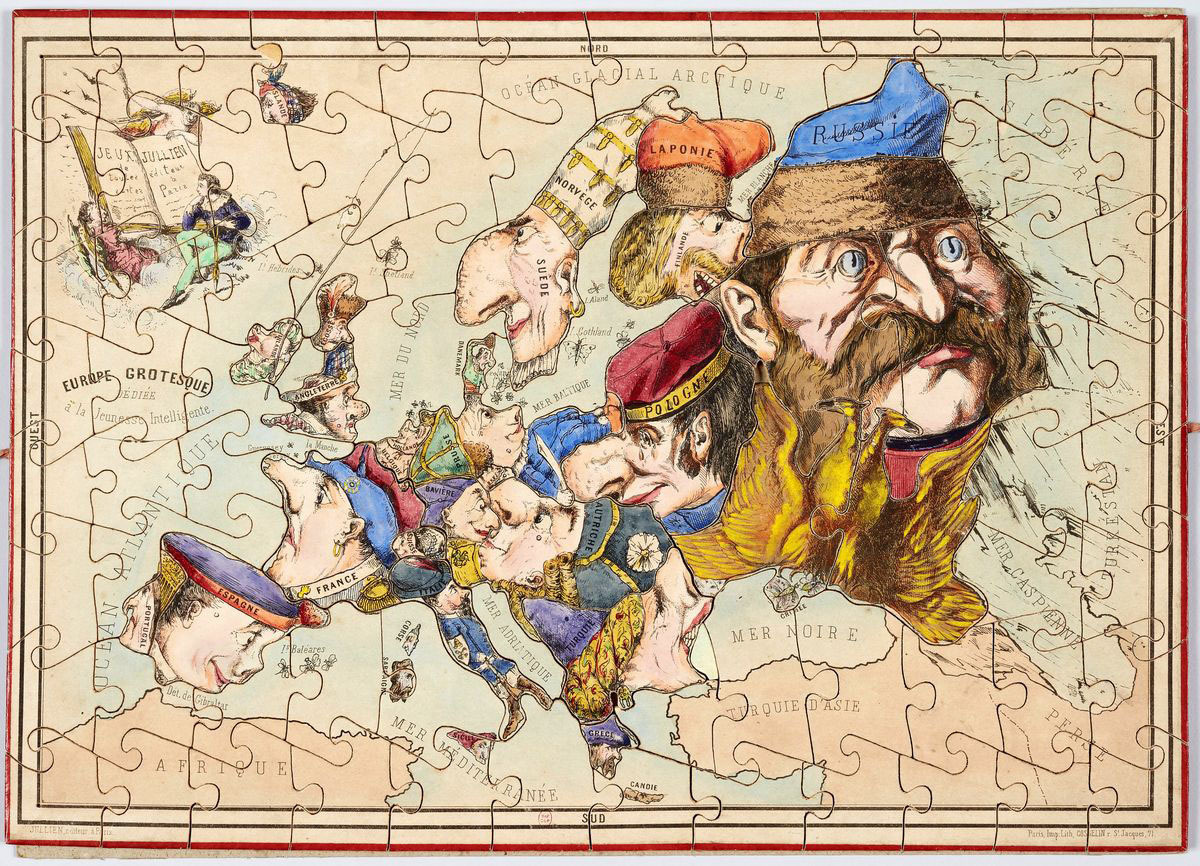 《地理拼图:献给智慧青年的怪诞欧洲地图》(Comprend le puzzle géographique : Europe Grotesque Dédiée à la Jeunesse Intelligente),Henri Demare,1865年