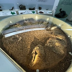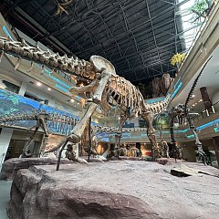 恐龙厅分专题展区介绍恐龙的生存、进化、演变、灭绝的历史,互动区设有与各类恐龙比身高、体重、速度等展项,参观者可触摸恐龙大腿骨、恐龙蛋、恐龙足印等展品,还能进入模拟的恐龙发掘和装架现场,零距离接触恐龙。