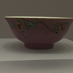 外壁胭脂红釉作地,绘粉彩垂枝石榴和蓝料彩花卉纹;碗内施满白釉,底面绘矾红彩不规则的五只蝙蝠。