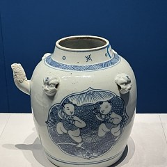 器高41.5厘米,属青花瓷中的大器,瓷胎缜密坚致,器型敦厚质朴。罐上以青花描绘众多男童扮官、对弈、执花、举莲、燃爆竹、骑竹马等嬉戏场景,表现出「多子多福」的传统观念。青花发色鲜丽,层次丰富,颇具康熙「五彩青花」的艺术特色。