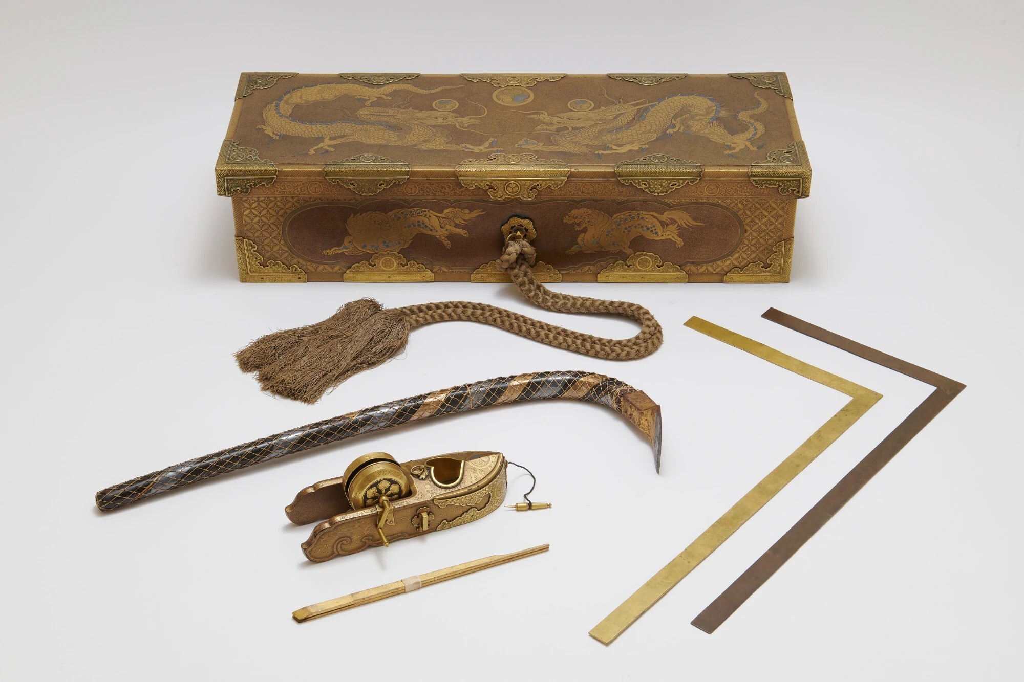 重要展品包括一组仪式用木工器具,相传由1636年担任日光东照宫大修工程总工程师的甲良宗广供奉,其中最引人注目的是一件工具箱,以高莳绘工艺在漆面浮雕龙与狮子纹样,并施以金银粉装饰,极具观赏价值。