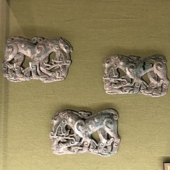 「早期猎人-匈奴与鲜卑」并列展出匈奴与鲜卑族制作的华丽配饰,呈现这两个民族高超的艺术表现力。「战士」单元介绍游牧战士的武备,除战斧、匕首、短剑、单刀等常见武器,也有铁饰皮护臂、青铜头盔、蒙古帝国风格胸背阔板大札等珍罕装备,其中圆刃管銎青铜钺为本展年代最早的文物。