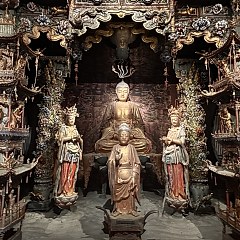 「隰州胜刹」依托金代隰州之印、清《隰州志》及清「重修小西天千佛寺记」木碑等文物,讲述小西天悠久的营造史,并通过大雄宝殿悬塑全景动态灯箱装置、大雄宝殿建筑复原模型等展陈实物与辅助装置,生动展现小西天精妙的建筑结构与悬塑艺术。