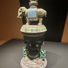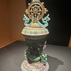 亮点展品包括清雍正款天蓝釉贯耳折方瓶、同治皇帝大婚时使用的金錾花双喜圆寿字纹茶碗、乾隆皇帝白玉云龙纽「文津阁」印等。