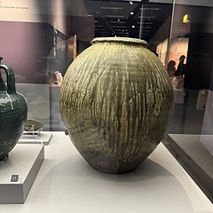 长沙窰青釉褐斑贴花人物纹壶,唐代,1982年湖南长沙望城铜官镇书堂乡古城村出土,长沙市博物馆藏