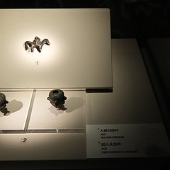 本展最重要的文物是一件战国时期的「鹰顶金冠」。这顶金冠1972年出土于内蒙古阿鲁柴登匈奴墓,是迄今发现的唯一一件匈奴「胡冠」实物,冠带浮雕虎、狼、羊、马四种动物,顶部装饰黄金及绿松石制成的雄鹰,代表了战国时期北方民族贵金属工艺的最高水平。