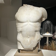 本次展品大部分为首次在希腊境外亮相,重磅展品之一是雕像「库罗斯」(Kouros),这尊大理石雕像大约制作于公元前520年,生动展现了一位面带微笑的长发男青年形象。「库罗斯」意为男青年,是古希腊古风时期(公元前7-前6世纪)中最具代表性的雕塑类型。本次展出的这尊雕像反映了当时贵族对「男神」的设想,展现了青年最具活力的一面。