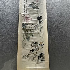 《松月梅图》是本次展品中尺幅最大的作品,画幅逾42平尺,是潘天寿对当时文艺界「中国画只能作小画」观点的有力驳斥。此画构图独特,墨梅从右下角直冲天际,松树则从左下角盘曲而上,两者呈现出剑锋相向之势,使人感觉到一股力量,有如冲纸欲出。