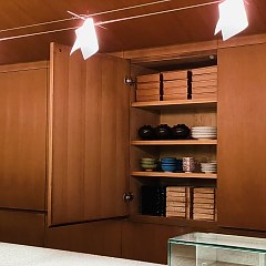 东京清友寿司吧由日本设计师仓俣史朗设计,1988年在东京新桥区开业。店内双层的拱形天花板、冷硬的花岗石寿司吧台和简约的室内装潢,为品尝寿司营造出剧院般的庄严氛围。设计中的光暗反差、线条流动及质感对比,充分展现仓俣史朗对物料和形态的感知。清友寿司吧于2004年结业,2014年由 M+ 购藏,整体拆卸并运到香港重建,是少数出自仓俣史朗之手而完整保留下来的室内设计作品之一。