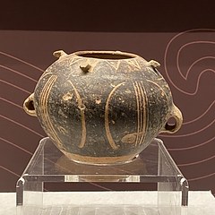 辛店文化距今3400-2800年,陶器以夹砂陶为主,彩陶多为黑彩,部分施白色或红色陶衣。纹饰以双勾纹(羊角纹)、s纹以及羊、犬、鹿、鸟等动物纹为主。寺洼文化距今3200-2700年,陶器多素面,马鞍口双耳罐最具代表性。