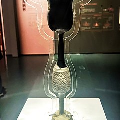 龙山文化蛋壳黑陶高柄杯1973年出土于日照东海峪遗址,器壁薄如蛋壳,杯身饰以细密的镂孔,柄内藏有陶丸。蛋壳陶表面乌黑发亮,有「黑如漆,明如镜,薄如纸,硬如瓷」的特点,是典型龙山文化的特征性器物,代表了中国远古时期制陶工艺的最高水平。