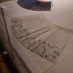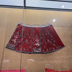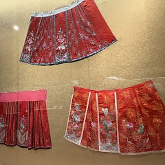 部分明代马面裙文物限时展出,包括山东博物馆藏蓝色缠枝四季花卉纹织金妆花缎马面裙、白色暗花纱绣花鸟纹马面裙及江西省博物馆藏黄褐色织缠枝莲花纹马面裙。