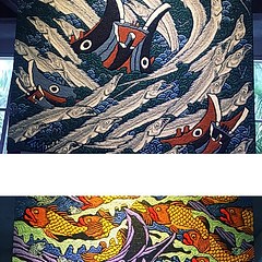 蒋德叶,舟山市普陀区虾峙岛黄石村人,16岁下海捕鱼,30多岁当上渔船老大,40岁时弃船上岸转行成为一名独立艺术家,至今已坚持创作10余载。他创作的渔民画,有船有鱼,不仅秉承了传统渔民画色彩丰富的特点,还开创了海洋系列作品写实的独特风格。