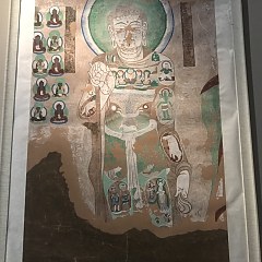 年代最早面积最大的壁画是数字高清复制品《天相图》,原作完成于公元3世纪,高229厘米,宽达500厘米,出自克孜尔石窟第118窟主室顶部,由日天、持杖托钵立佛、挟猿猴的金翅鸟、雨神、对鸟、立佛和月天组成,两侧菱格内绘图案化的树木和水池、坐禅比丘、伎乐和鸟兽等,表现山林禅修的意境。