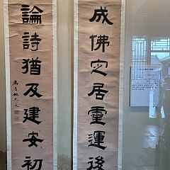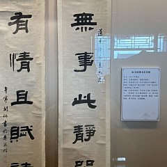 清代学术风气的转变同样促进了隶书的复兴。清代隶书直追古法,取法魏晋铭碑、唐碑,并在此基础上向汉碑字体回归,在继承汉代隶书后又赋予新的精神。第二单元重点展品之一是篆隶中兴先驱伊秉绶的隶书五言联,呈现其「融颜入隶」的独特风格。