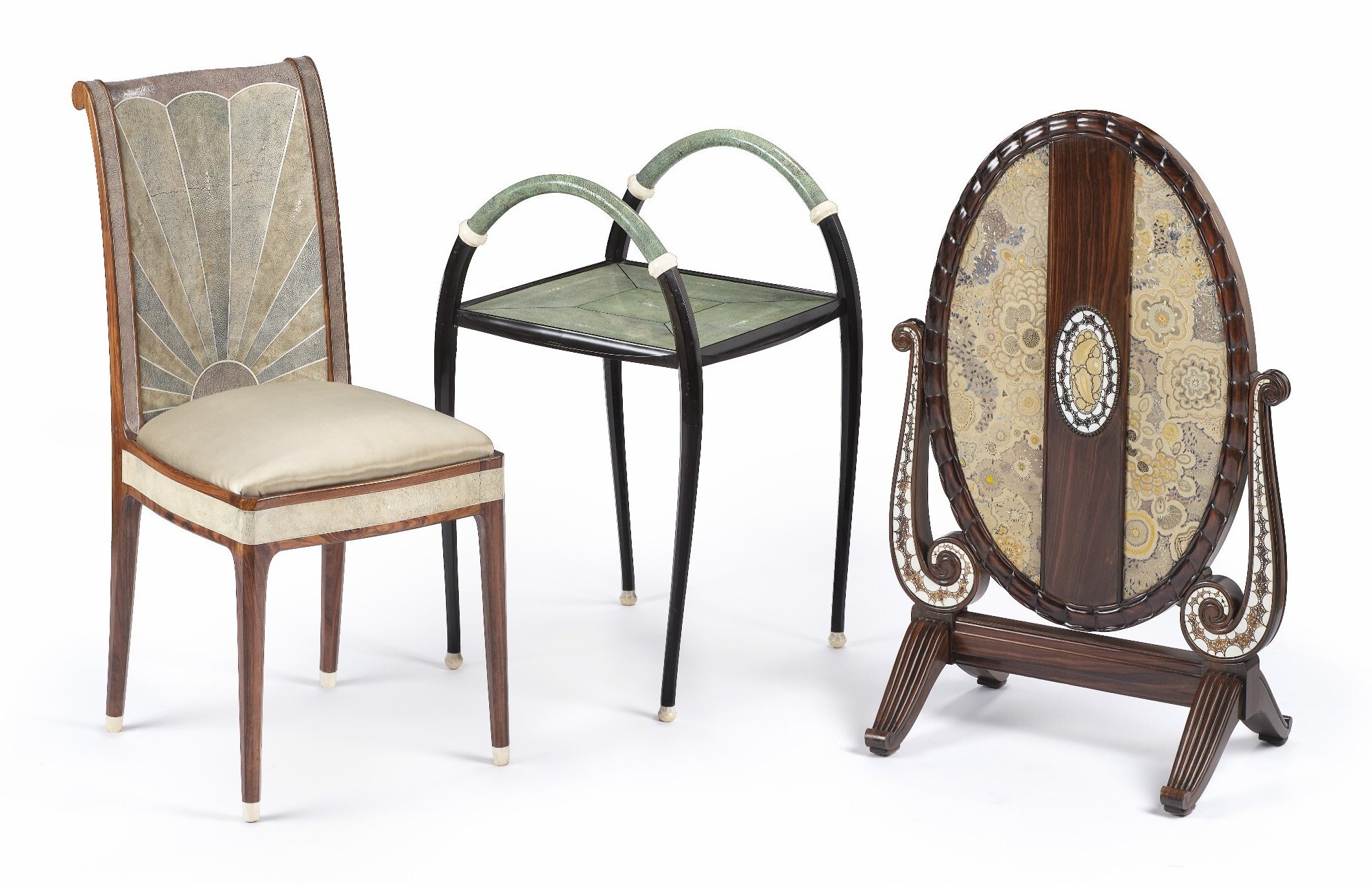 重要展品包括多位装饰艺术代表人物作品,如 André Groult 设计的鱼皮橱柜,Jacques-Émile Ruhlmann 设计的家具,以及为本展特别还原的、Pierre Chareau 为法兰西大使馆设计的书房图书馆。