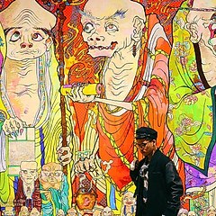 村上隆因对日本文化的灵活运用著称,《五百罗汉图》就是从日本传统佛教绘画中取得灵感的作品。值得一提的是,日本江户时代画家狩野一信(Kano Kazunobu,1816~1863)的代表作《五百罗汉图》与本展同步展出,展场位于德川家族的灵庙、东京都港区增上寺。