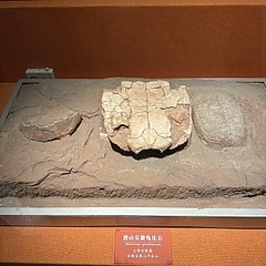 展厅中央陈列了一具淮河古菱齿象化石标本,1972年出土于安徽怀远县茨淮新河工地,是迄今我国发现的同类象化石中比较完整的骨架之一。这头象形体较大,高4米,长8米,从骨骼和骨缝的愈合程度等体质特征推测,这是一只约60岁的老年雄象。