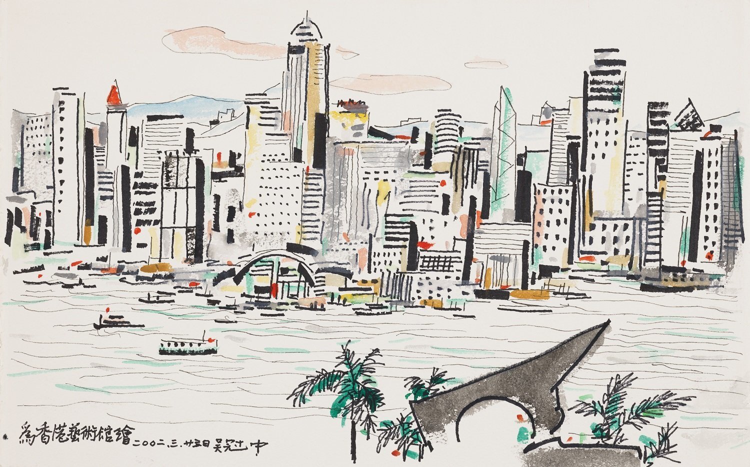 《维港写生》,吴冠中,2002年,纸本墨水及水彩