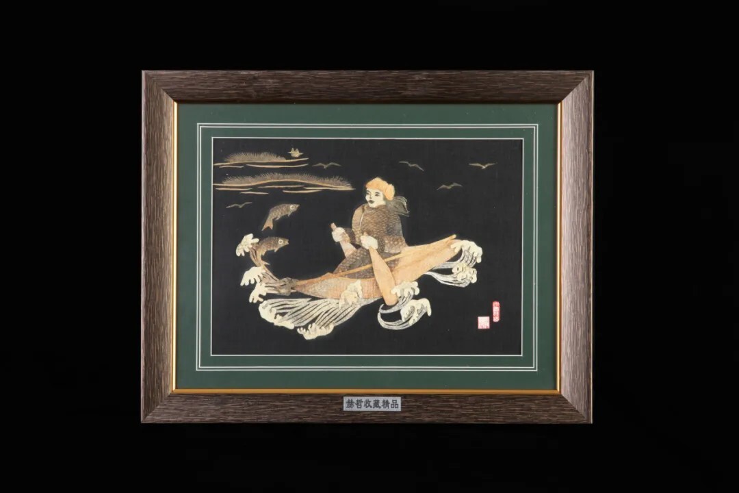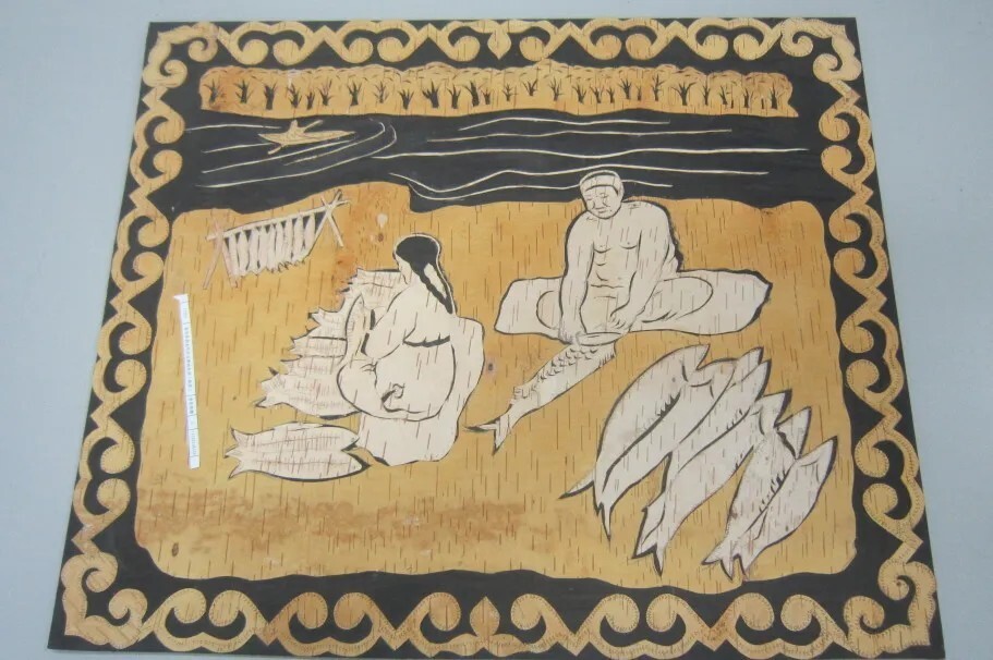 鄂伦春族渔民生活桦树皮画《叉鱼》