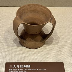 距今约4000年,高22厘米,通体施紫红彩,口沿内外绘倒三角网纹,耳部绘折带纹,腹部两面分层绘复道三角纹,腹两侧绘菱形网纹。