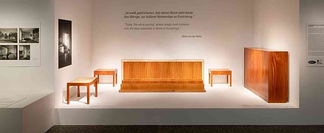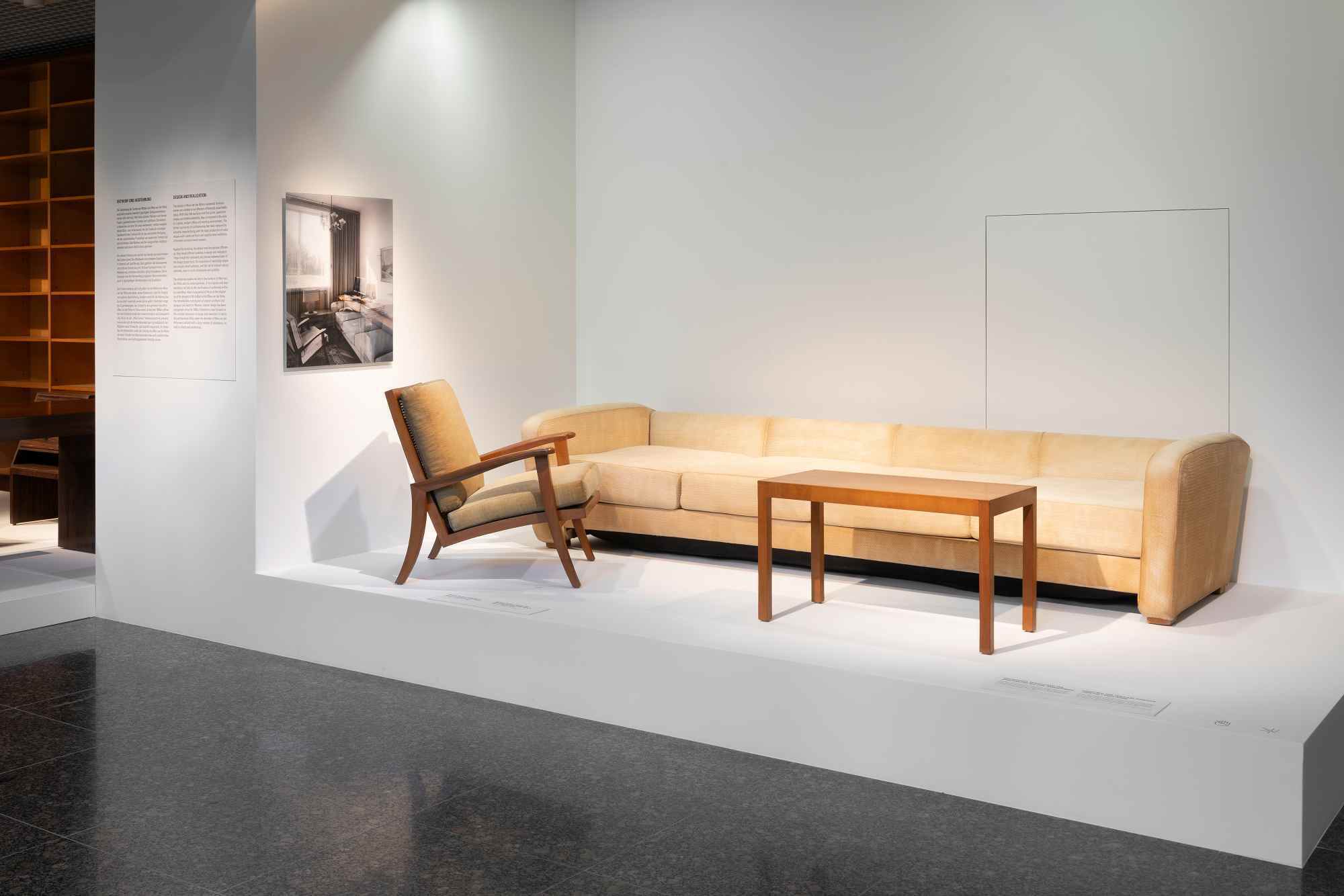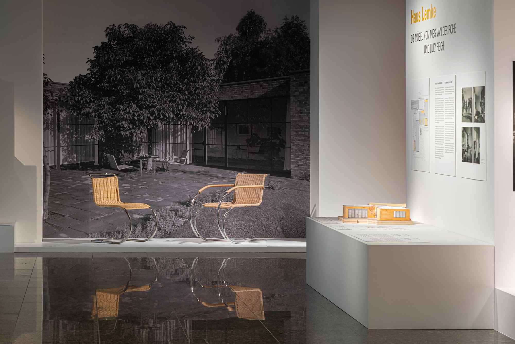本次展览为首次完整展出柏林「莱姆克之家」的家具,其室内设计以优雅的贴面实木家具为基础,通过严谨的几何形态与空间比例,表现材料的原生之美,户外花园放置富有现代感的钢管桌椅,形成风格上的反差。