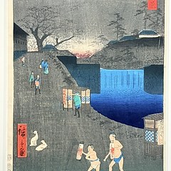 小林清亲(1847-1915)是日本明治时代浮世绘画家,以开创受到西洋画法影响的「光线画」闻名,为明治时期的风景版画带来了重大变革。小林清亲的版画虽以「东京名所」为题,却多表现黄昏时分的景象及黑暗中闪烁的光芒,通过深邃的明暗对比,捕捉城市中残留的江户氛围。他的作品唤起人们的怀旧之情,与同时代浮世绘画家们通过鲜艳色彩表现新时代都市风貌的「开化绘」截然不同。