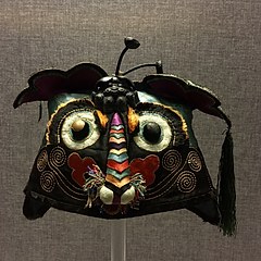 土黄缎地彩绘剪纸绣虎头帽,清代