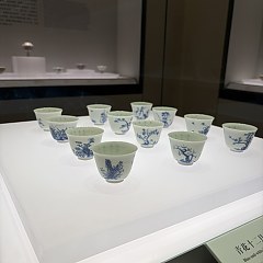 最重要的一件展品为元青花四爱图梅瓶,这件梅瓶于2006年在钟祥市郢靖王墓出土,瓶腹部四个海棠形开窗分别绘有王羲之爱兰图、陶渊明爱菊图、周敦颐爱莲图、林和靖爱梅鹤图,画面情境交融,人物形神兼备,是现存极为稀少的以人物图案为主要题材的元代青花瓷器珍品。