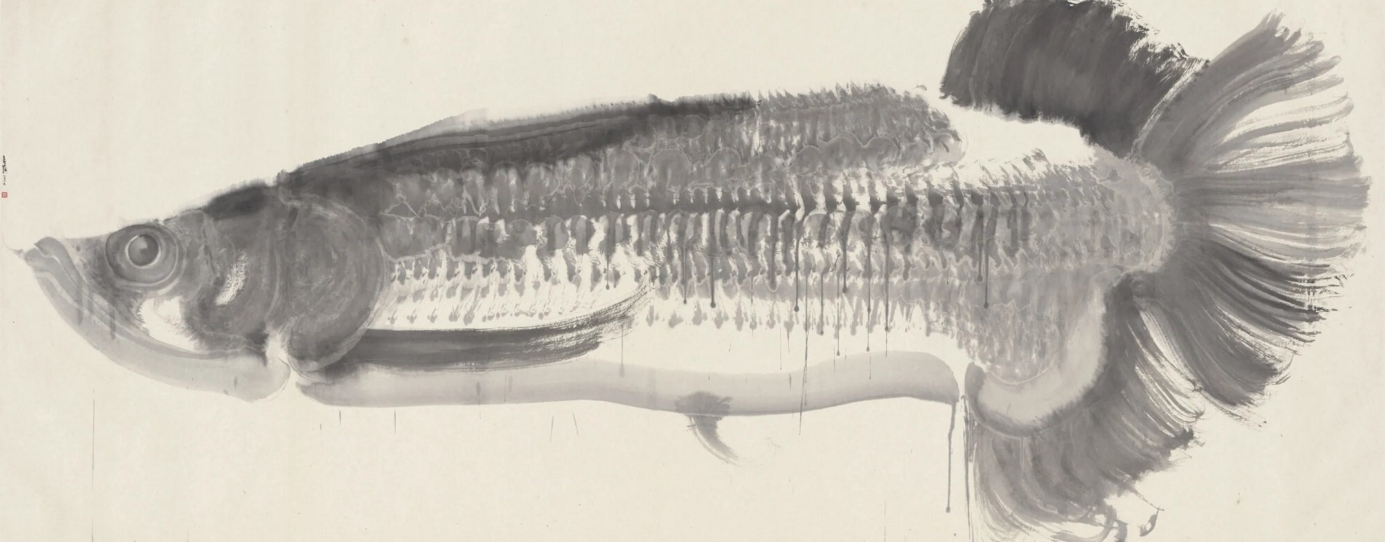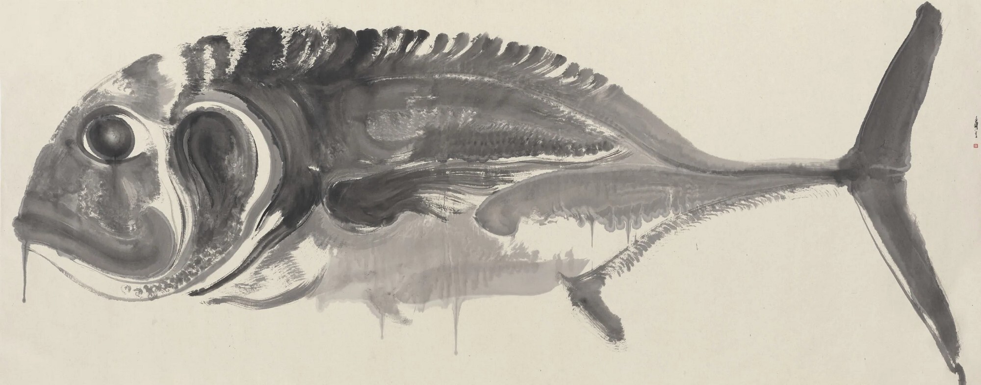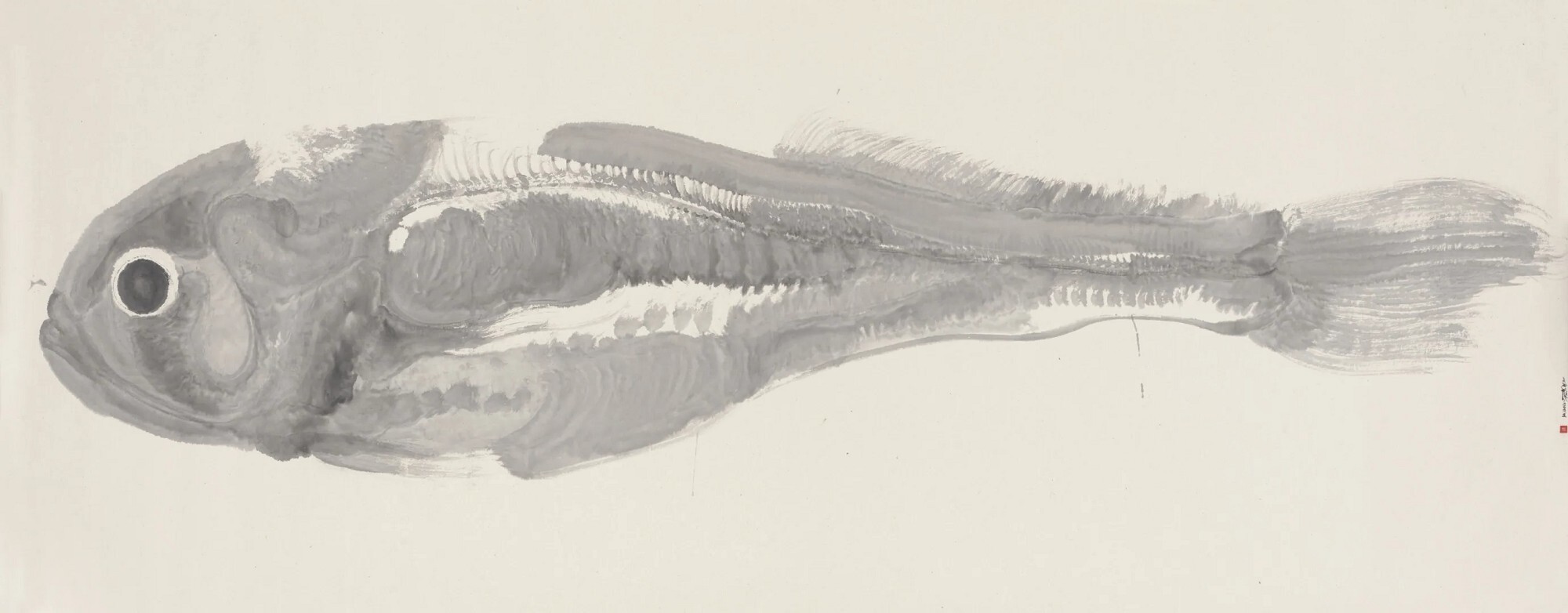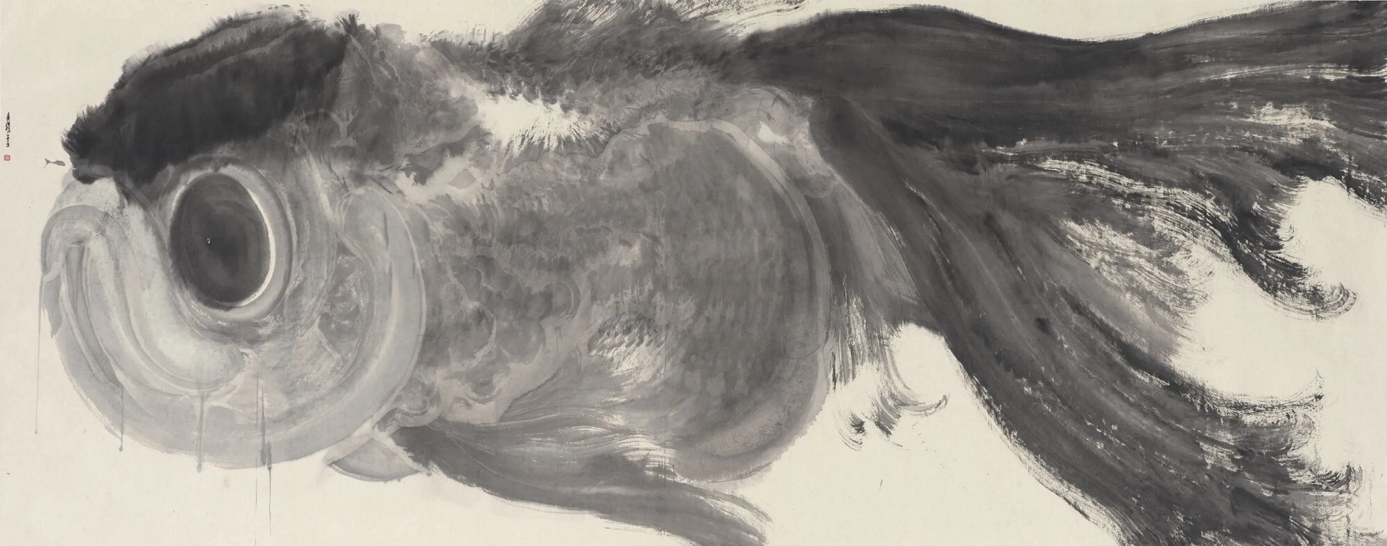 周京新舍弃鳞片细节的繁复描摹,将游鱼凝练为高度概括、力量内敛的笔墨语言本身,以物理放大的宏阔视觉尺度进行表现,构建出一个纯粹而充满生命张力的「鱼」世界。