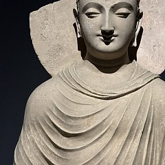 本次展览中最值得注目的展品是一件结禅定印跌坐的佛陀像,这件佛像的脸部雕刻十分优美,面容端庄秀丽,嘴角微翘,像是含着一抹淡淡微笑。衣纹飘逸流畅,整体姿态祥和,保存完好,堪称犍陀罗佛像中的佳作。