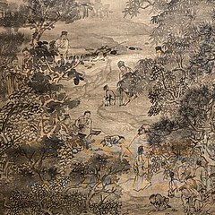 「兰亭修禊」「曲水流觞」是中国画中表现春景特有的题材。文人墨客们带着童子到春景秀丽的郊外进行雅集活动,他们或野餐饮酒,或煮茶品茗,或下棋对弈,或赏景观鹅,或吟诗作画。