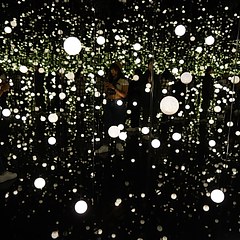 本次展览将展出日本艺术家草间弥生(Yayoi Kusama)近期创作的60件绘画、雕塑和艺术装置,包括1件首次亮相的「无限镜屋」系列新作「飞向宇宙的舞动灯光」(Dancing Lights That Flew Up to the Universe)。