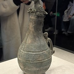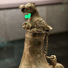 匏(páo),即葫芦,匏壶意为形似葫芦的壶。青铜匏壶仅见于春秋战国时期的黄河以北地区。这件匏壶既体现了华夏青铜器纹饰传统,又融入草原文化的立体鸟钮、链环结构等元素,整体造型可能模仿游牧民族的皮囊壶,体现了春秋战国时期华夏与草原民族的交流共生。